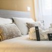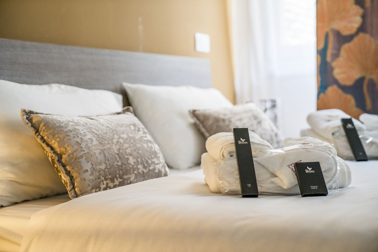 Mr. Brown accoglie ogni ospite con un kit di benvenuto che include morbidi asciugamani, ciabattine, set estetico e pettine.