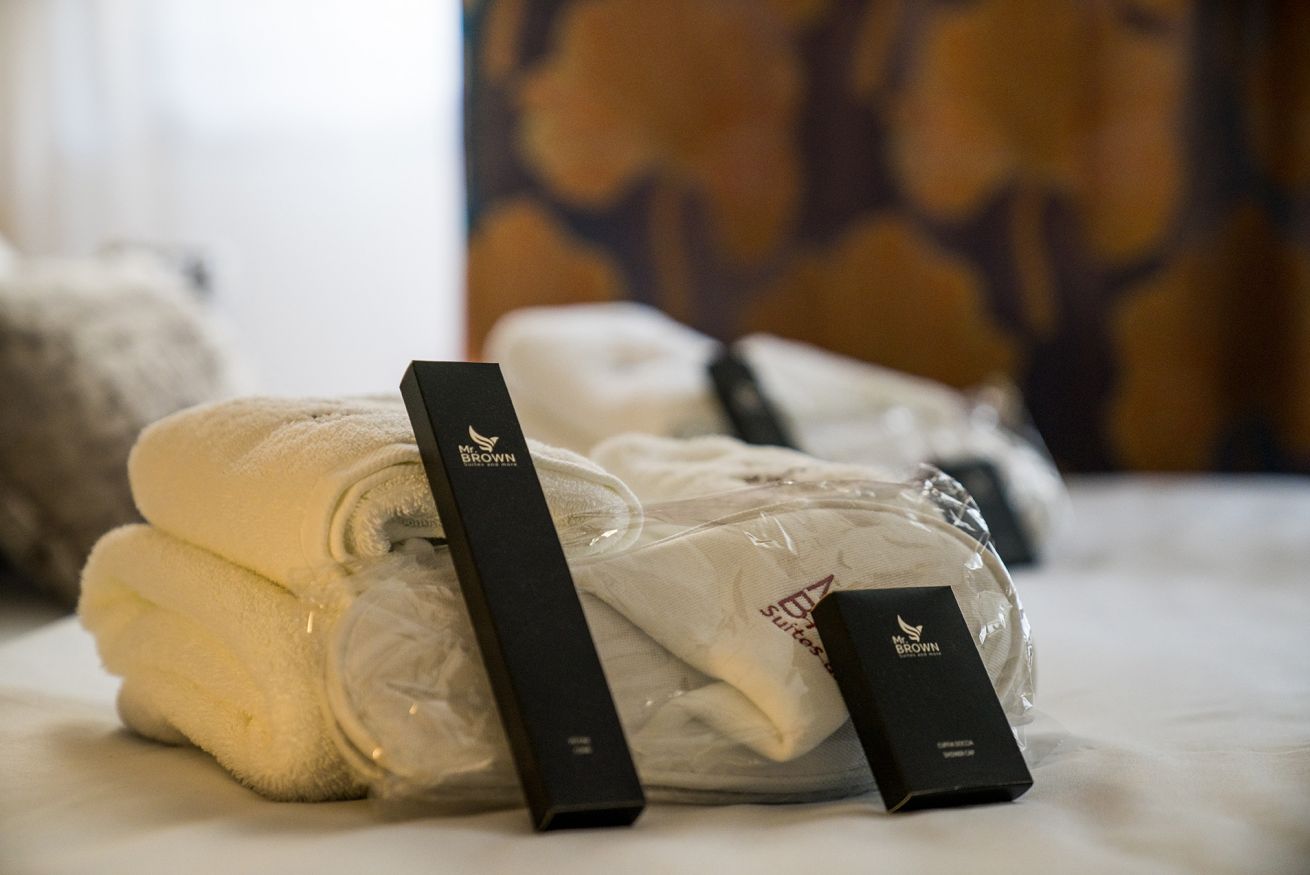 Mr. Brown accoglie ogni ospite con un kit di benvenuto composto da morbidi asciugamani, ciabattine, set estetico e pettine.